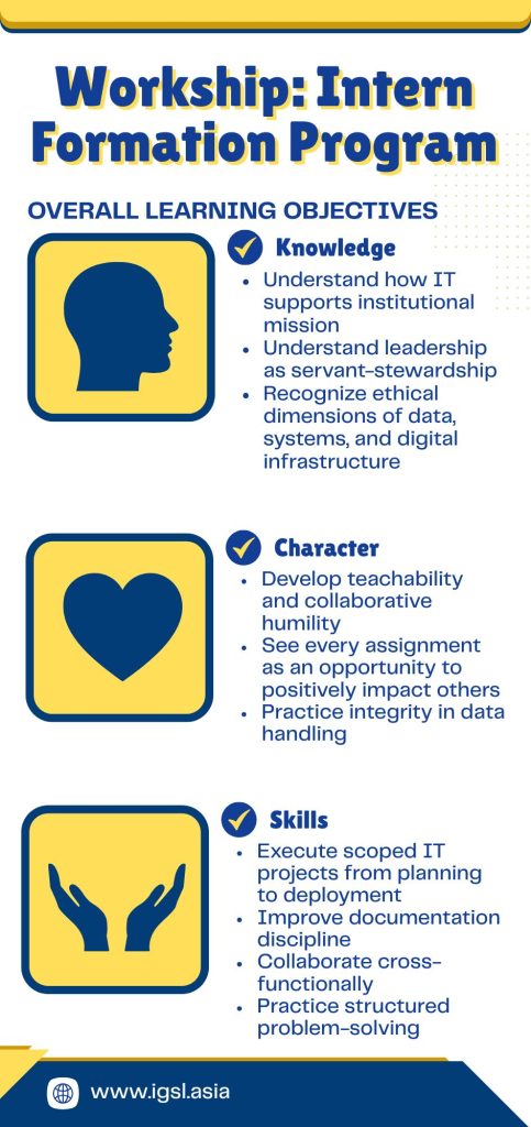 From February to May 2026, four graduating IT college students are serving with us at IGSL as interns. Through the initiative and effort of four staff members, the interns are going through the intern formation program called Workship. This program aims to develop not only capable IT professionals but principled individuals who understand the larger purpose of their work. Every week, the interns work on collaborative IT projects that will benefit the school while intentionally shaping their understanding of work, leadership, and calling.